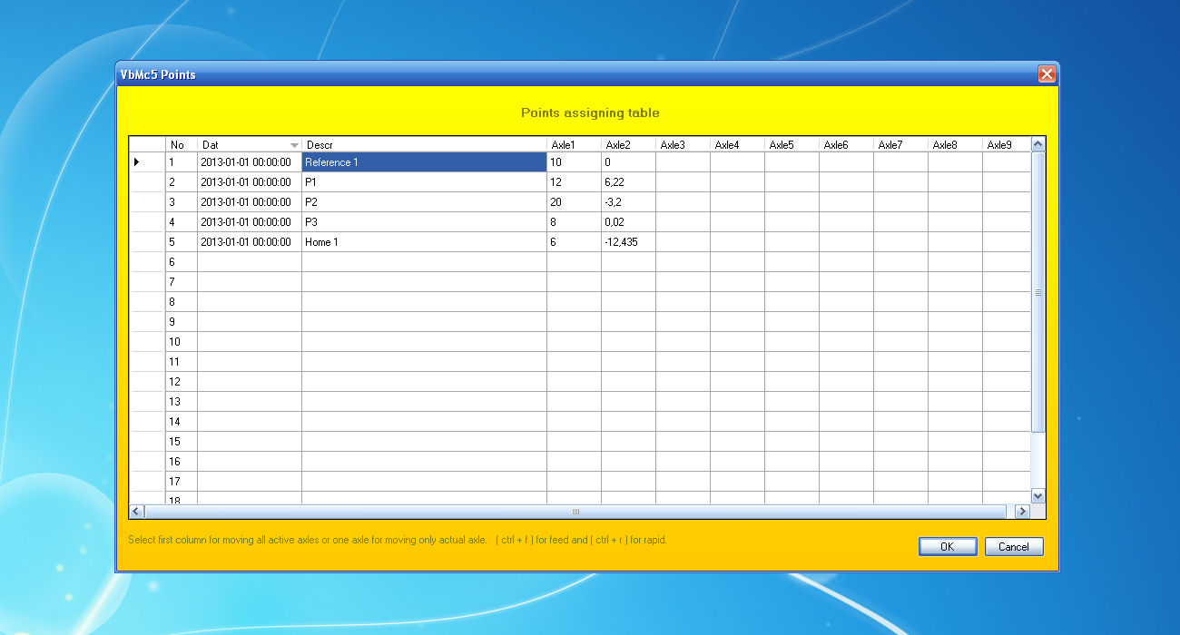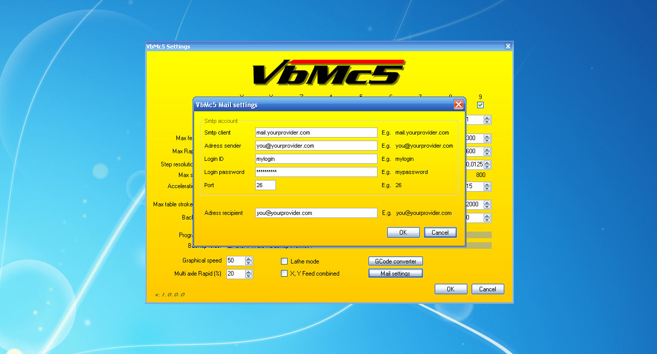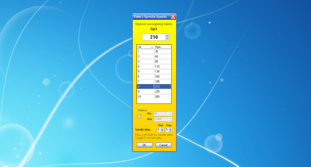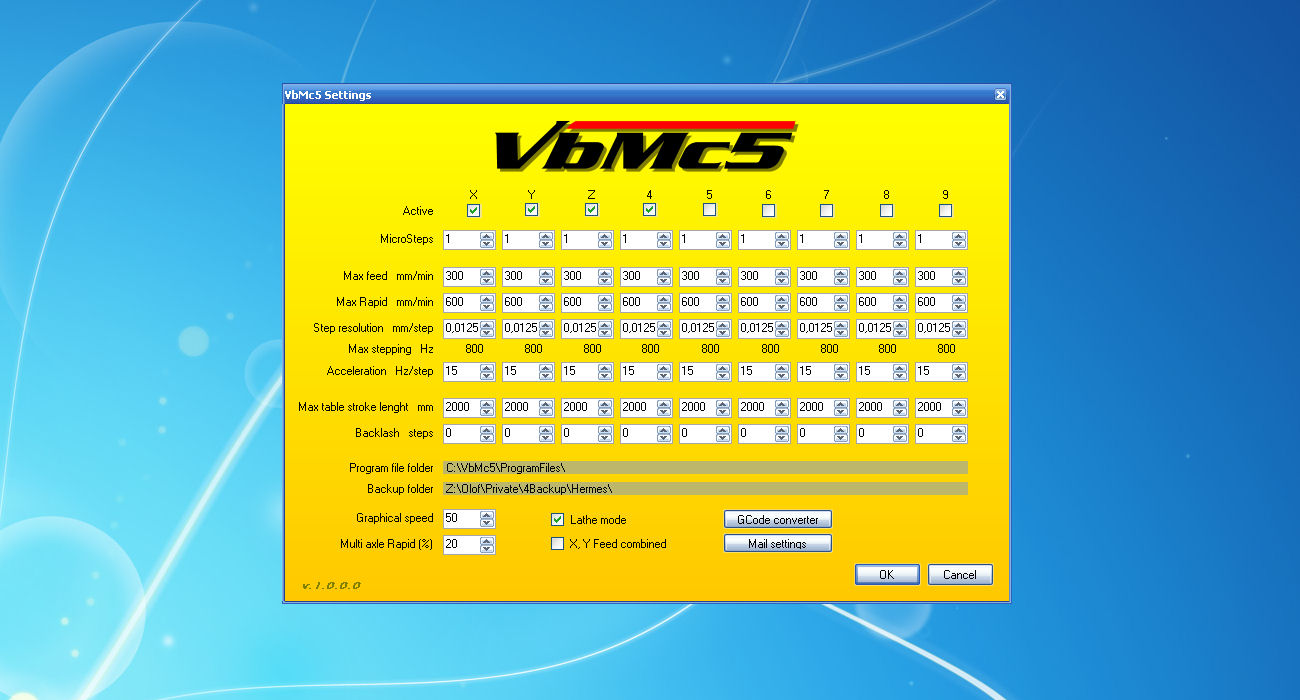 - Inställningar. För hastigheter, accelerationer, max och min-värden, glappkompensation mm.